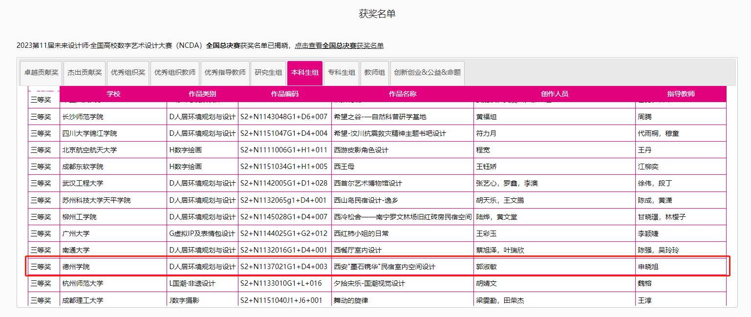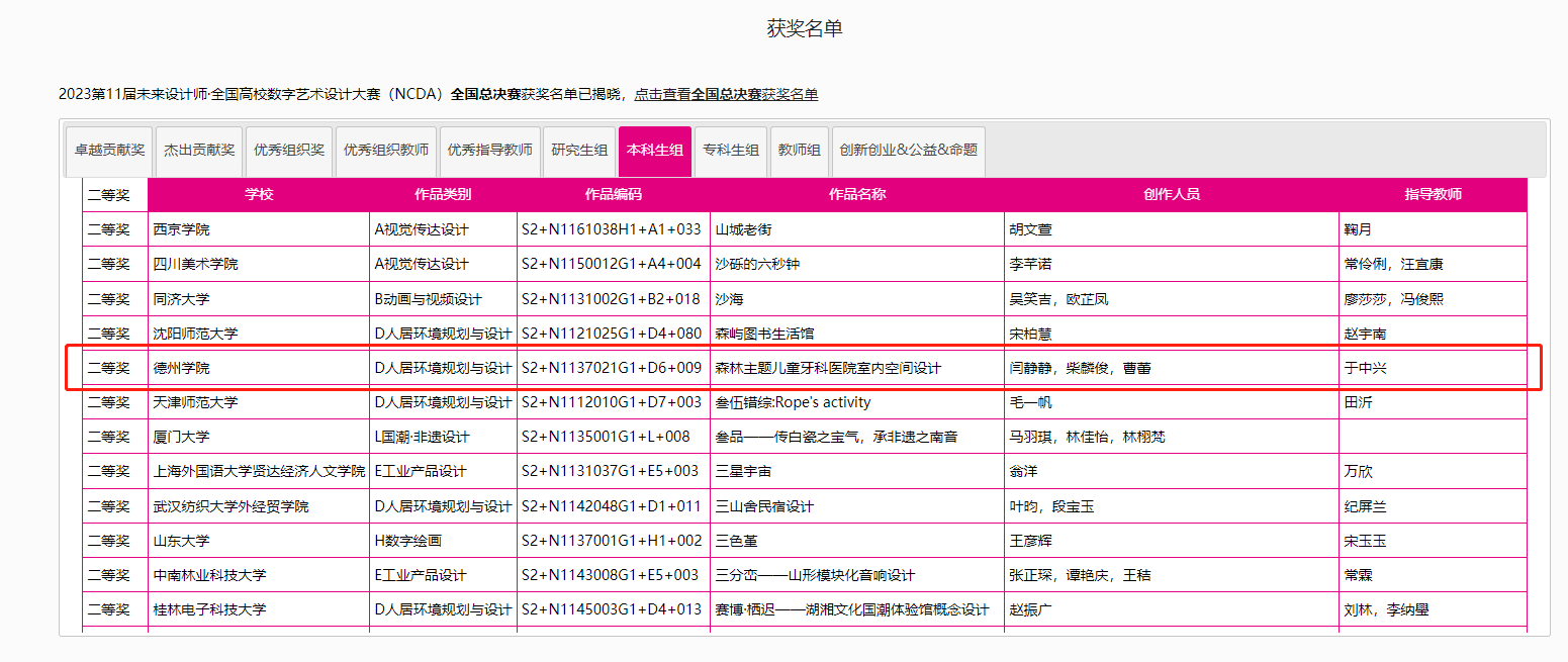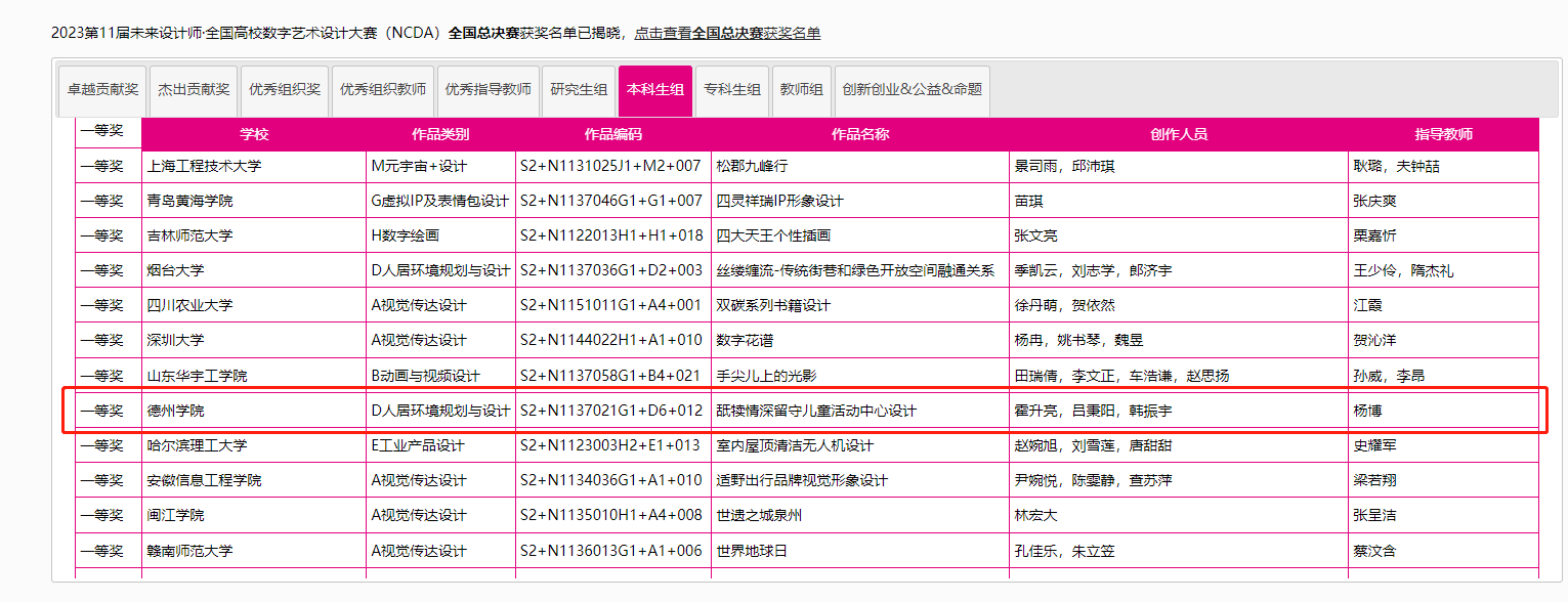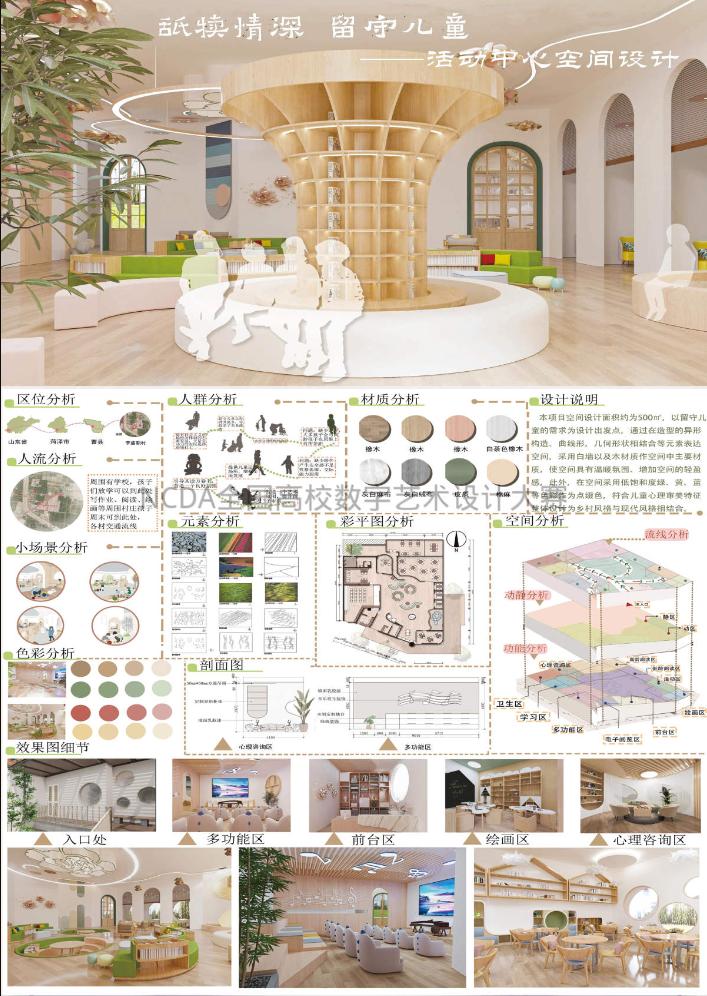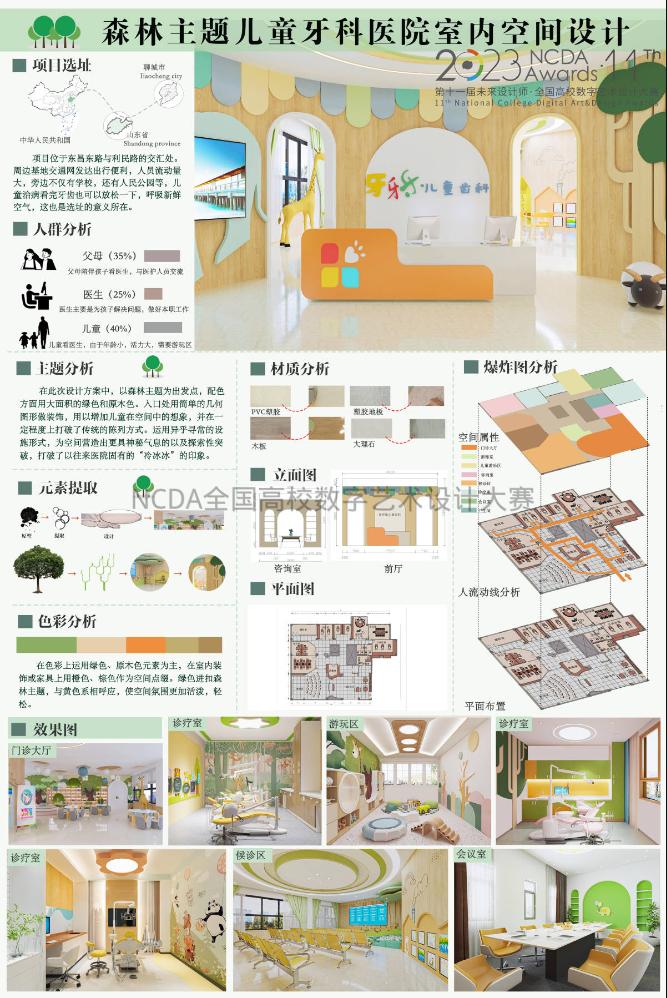 8月25日,2023第11届未来设计师·全国高校数字艺术设计大赛(NCDA)全国总决赛奖项公布,伟德国际victor1946三项作品榜上有名,取得了优异成绩。其中由杨博老师指导,霍升亮、吕秉阳、韩振宇创作的作品《舐犊情深留守儿童活动中心设计》拔得头筹,喜获全国总决赛一等奖;由于中兴老师指导,闫静静、柴麟俊、曹蕾同学创作的作品《森林主题儿童牙科医院室内空间设计》获得全国总决赛二等奖;由申晓旭老师指导、郭淑敏同学创作的作品《西安"墨石镌华"民宿室内空间设计》获得全国总决赛三等奖。