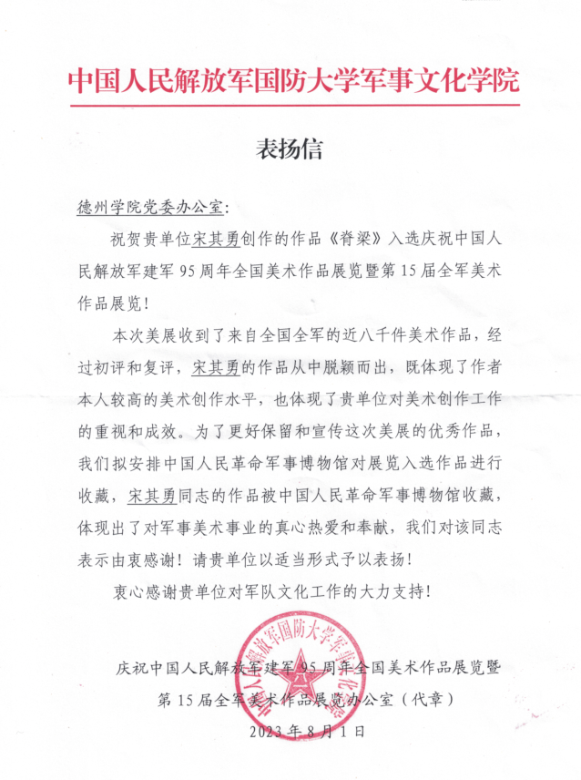 近日,中国人民解放军国防大学军事文化学院向我校发来表扬信,祝贺伟德国际victor1946教师宋其勇的作品《脊梁》入选庆祝中国人民解放军建军95周年全国美术作品展览暨第15届全军美术作品展览。同时表扬宋其勇的作品从全国近八千件作品中脱颖而出,体现出作者本人较高的美术创作水平以及我校对美术创作工作的重视和成效。宋其勇的作品被中国人民革命军事博物馆收藏,体现出对军事美术事业的真心热爱和奉献。