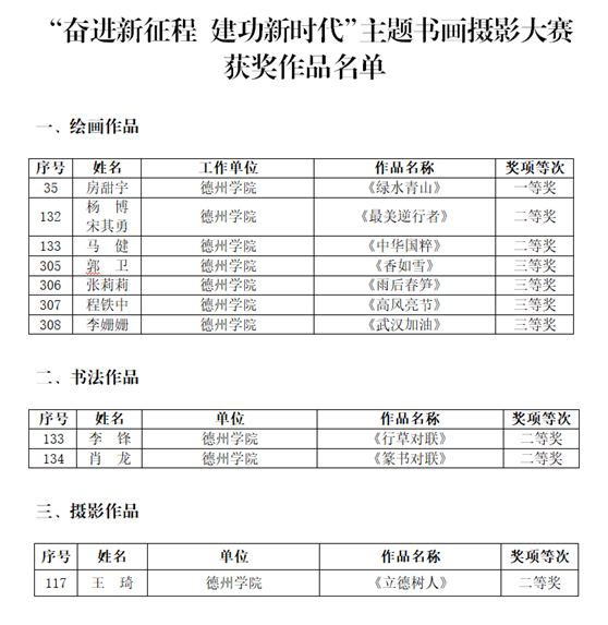 近日,山东省教育厅公布了“奋进新征程 建功新时代”主题书画摄影大赛获奖结果,伟德国际victor1946教师房甜宇的作品《绿水青山》获绘画类一等奖,杨博、宋其勇、马健老师作品获绘画类二等奖,李锋、肖龙老师作品获书法类二等奖,郭卫、张莉莉、程铁中、李姗姗老师作品获绘画类三等奖。获奖数量与层次在同类院校中名列前茅。